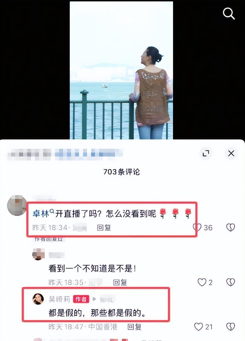 评论区网友留言“卓林开直播了吗?怎么没看到呢”,吴绮莉回复“都是假的,那些都是假的”,对于网络上的真真假假她全盘否定。女儿并没有在网络平台直播带货,两母女应该是还有联系的,对于女儿的近况吴绮莉是清楚知晓的,也同样是为广大网友提个醒,千万不要被一些别有用心的人蒙蔽了双眼。